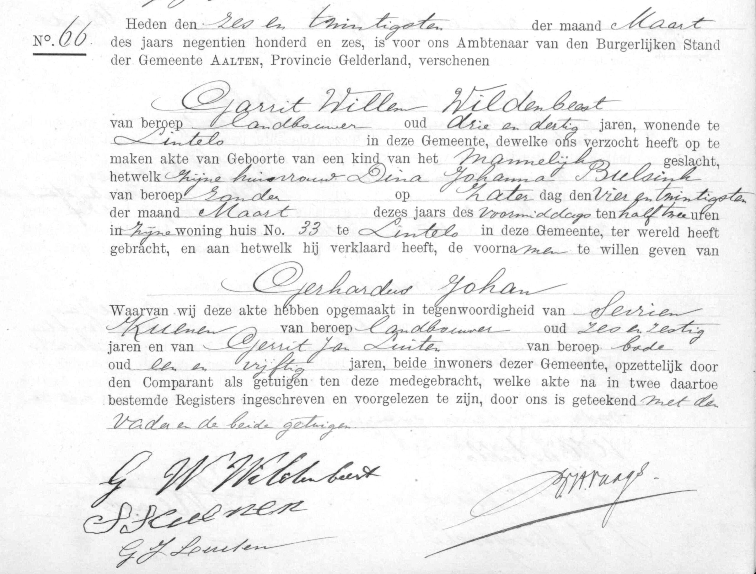 Gerhardus Johan (Gerhard) Wildenbeest is de zoon van Garrit Willem Wildenbeest en Dina Johanna Bulsink. Hij is geboren op 24-03-1906 in Aalten. Gerhard is overleden op 10-11-1983 te Breedenbroek.